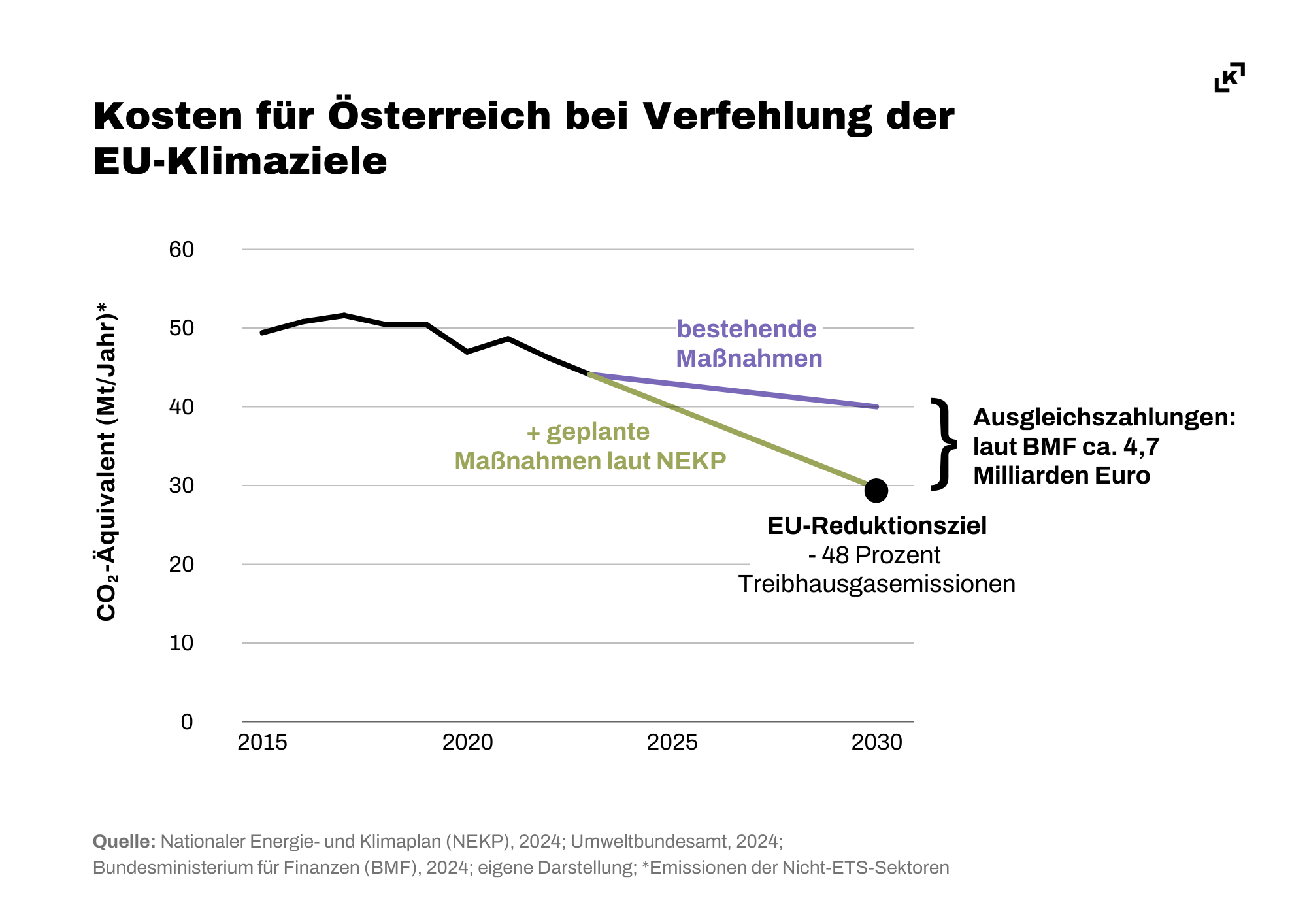 Im Jahr 2023 wurden die Ziele auf EU-Ebene durch den Green Deal verschärft: Seitdem ist Österreich verpflichtet, bis 2030 48 Prozent seiner Emissionen im Vergleich zu 2005 zu reduzieren. Anders als beim ETS trägt Österreich für die Einhaltung dieses Klimaziels staatliche Verantwortung. Als letztes Mitgliedsland hat die Bundesregierung im August 2024 einen Integrierten Nationalen Energie- und Klimaplan (NEKP) bei der EU-Kommission eingereicht.