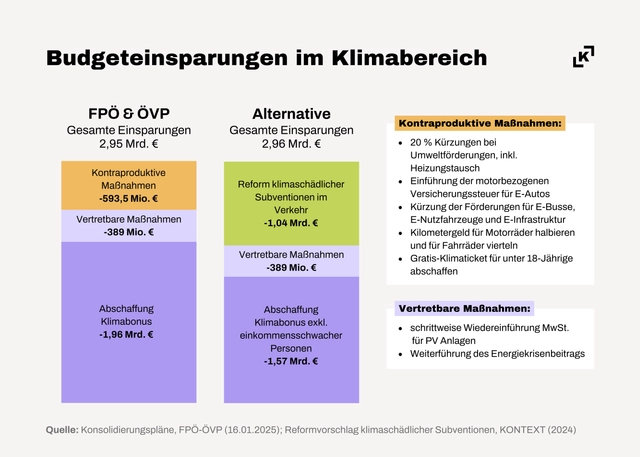 Die FPÖ- und ÖVP-Verhandler haben ihre Klima-Sparpläne für eine mögliche Koalition vorgestellt. Etwa ein Drittel der Einsparungen betrifft den Klimabereich, wobei einige Maßnahmen sinnvoll sind, während andere Rückschritte im Klimaschutz bedeuten. Besonders die Einschnitte bei Umweltförderung und E-Mobilität verzögern positive wirtschaftliche Effekte. Eine Reform klimaschädlicher Subventionen könnte eine bessere Lösung bieten, um sowohl die Wirtschaft zu stärken als auch Klimaziele zu erreichen.