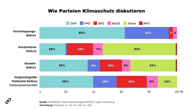 Betrachtet man die österreichischen Parteien, zeigt sich, dass insbesondere die Österreichische Volkspartei (ÖVP) und die Freiheitliche Partei Österreichs (FPÖ) Klimaschutz überproportional häufig verschleppen: 62 Prozent aller Aussagen, die Klimaschutz verzögern, kommen von der ÖVP, weitere 31 Prozent von der FPÖ. Die einzigen drei Aussagen der Stichprobe, die Klimaschutz leugnen, stammen ebenfalls von Politiker:innen der FPÖ.