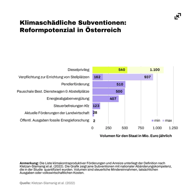 Um die verpflichtenden EU-Klimaziele zu erreichen und Strafzahlungen zu vermeiden, muss Österreich seine Emissionen bis 2030 um 48 Prozent reduzieren. Die Abschaffung oder Ökologisierung der klimaschädlichen Subventionen könnte laut dem Nationalen Energie- und Klimaplan mindestens zwei Millionen Tonnen CO2-Äquivalent einsparen.