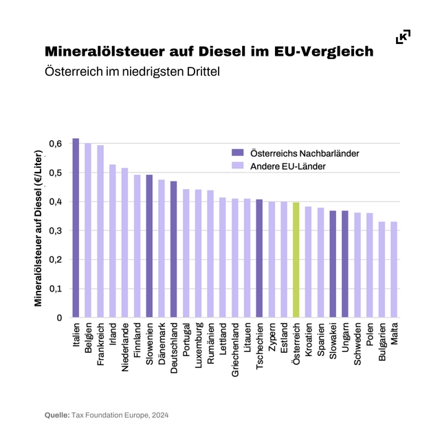 Im EU-Vergleich liegt die MÖSt auf Diesel in Österreich im untersten Drittel. Dieser Preisunterschied fördert, zusätzlich zum inländischen Verbrauch, den Kraftstoffexport im Tank. Dieser sogenannte „Tanktourismus“ verursacht rund ein Fünftel der Emissionen in Österreichs Verkehrssektor. Die geringere Mineralölsteuer auf Diesel hält zudem die Verlagerung des Güterverkehrs auf die Bahn zurück und verursacht durch gefahrene Umwege zusätzliche Emissionen. Historisch gesehen waren die Einnahmen aus dem Kraftstoffexport eine lukrative Einnahmequelle für den Staat. Eine Steuerangleichung wurde daher lange vermieden. Inzwischen ist der ökonomische Nutzen des Kraftstoffexports durch die anfallenden Ausgleichszahlungen an die EU bei Verfehlung der Klimaziele jedoch nicht mehr darstellbar.