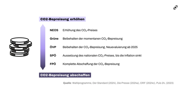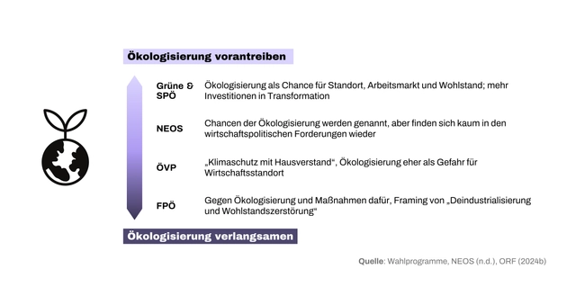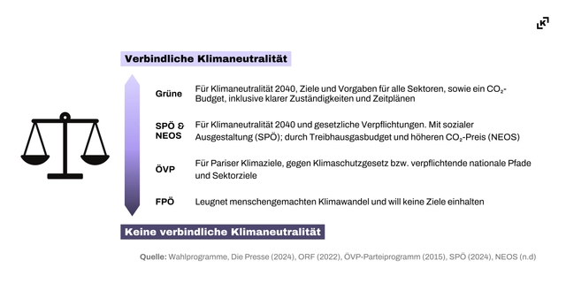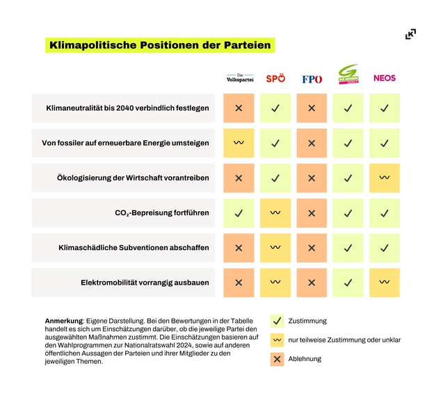 Die Autorinnen haben für die Studie die Einstellungen der Parteien im Nationalrat zu sechs zentralen klimapolitischen Themen anhand ihrer Wahlprogramme und ergänzender öffentlicher Aussagen untersucht, um daraus Ableitungen für rechnerisch mögliche Regierungskonstellationen zu treffen.