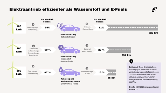Anders als vielfach dargestellt, werden mit dem diskutierten EU-Gesetz Verbrennungsmotoren nicht verboten – enden soll lediglich die Zulassung für Autos, die CO₂ ausstoßen. „Wer also das sogenannte „Verbrenner-Aus“ kippen will, setzt sich dafür ein, dass weiterhin mit Benzin und Diesel gefahren wird. Denn E-Fuels und Wasserstoff bleiben erlaubt, auch wenn sie im PKW-Bereich ineffizient, teuer und kaum verfügbar sein werden“, sagt KONTEXT-Vorständin Katharina Rogenhofer.