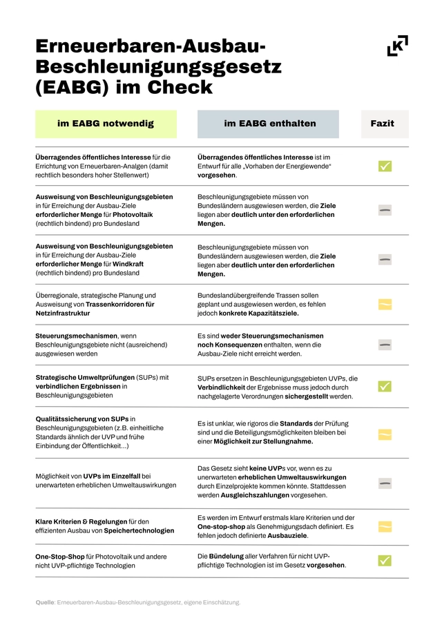 Positiv hervorzuheben ist, dass “alle Vorhaben der Energiewende” fortan von “überragendem öffentlichen Interesse” sein sollen und der Ausbau der erneuerbaren Energie damit rechtlich einen besonders hohen Stellenwert bekommt. Zudem werden alle Verfahren, die nicht-UVP pflichtige Technologien – wie kleine PV-Anlagen und Speicher – betreffen, gebündelt. Diese “One-Stop-Shops" können, bei guter Umsetzung, zur Beschleunigung des Ausbaus beitragen.