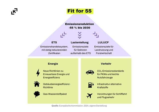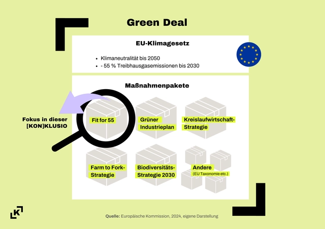 - Was ist der Green Deal? Das Kernstück des Green Deal bildet das Europäische Klimagesetz, welches das Ziel der EU, bis 2050 klimaneutral zu werden, verbindlich festlegt. Das Fit-For-55-Paket schafft den rechtlichen Rahmen zur Erreichung einer Reduktion der Emissionen um 55 Prozent bis 2030 und setzt zusätzlich sektorspezifische Maßnahmen. Daneben umfasst der Green Deal eine große Anzahl weiterer Rechtsakte. Ihre Ziele, Maßnahmen und den Umsetzungsstatus beleuchtet die vorliegende Analyse.