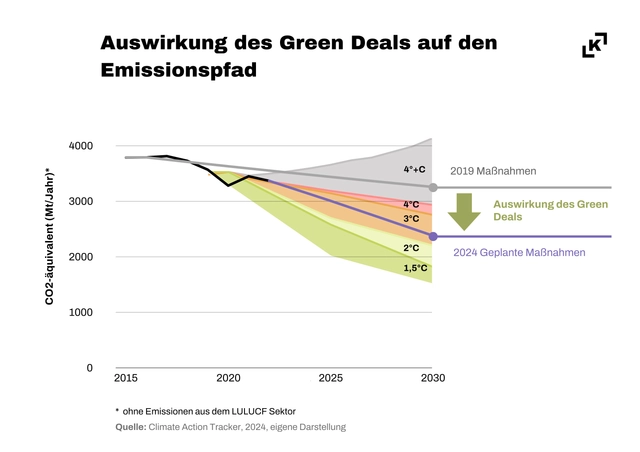 - Wo steht die Umsetzung und was hat der Green Deal gebracht? Zwar wurde ein Großteil der Rechtsakte des Green Deals bereits beschlossen, die meisten davon stehen jedoch erst am Anfang ihrer Wirkungsperiode. Manche warten auch (national) noch auf ihre Umsetzung – ihre Wirkung kann sich erst in den kommenden Jahren entfalten. Dennoch haben die neuen Rechtsakte die EU nahe an einen 2 °C-Pfad gebracht – eine Verbesserung um mehr als 1°C im Vergleich zu den Prognosen vor dem Green Deal.