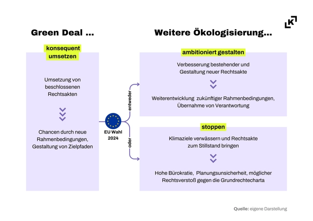 - Welchen Gestaltungsspielraum gibt es? Um die Klimaziele und eine Transformation der Wirtschaft zu erreichen, ist es notwendig, die Ökologisierung nach der EU-Wahl ambitioniert weiterzuführen und das von der Kommission vorgeschlagene Klimaziel für 2040 zu konkretisieren. Für Österreich ergibt sich aus den Rechtsakten ein umfangreicher Umsetzungsbedarf. Bei unzureichender Umsetzung riskiert Österreich Kürzungen von Fördermitteln, hohe Strafzahlungen und Vertragsverletzungsverfahren mit schwerwiegenden Konsequenzen.