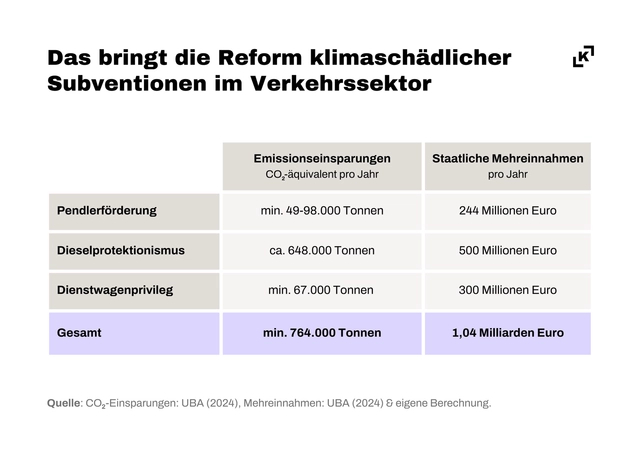 Wie eine neue Studie des KONTEXT Instituts für Klimafragen zeigt, könnten allein im emissionsstarken Verkehrssektor durch die Abschaffung von drei der größten klimaschädlichen Subventionen jährlich rund 1,04 Milliarden Euro eingespart und mindestens 764.000 Tonnen CO₂-Äquivalente pro Jahr vermieden werden.
