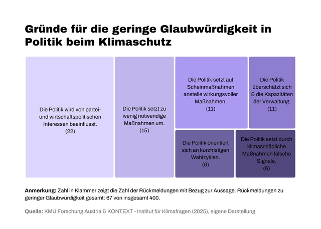 Als Hauptgründe für die fehlende Glaubwürdigkeit der Politik werden von den befragten Unternehmen vor allem partei- und interessenspolitische Einflüsse angeführt, die notwendige Maßnahmen verhindern. Auch eine unzureichende Umsetzung von Maßnahmen in Bereichen, die als besonders wichtig empfunden werden, werden kritisiert.