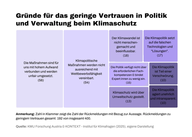 Dem fehlenden Vertrauen liegt häufig die Überzeugung zugrunde, dass klimapolitische Maßnahmen unbürokratischer, fairer und unternehmensfreundlicher umgesetzt werden könnten. Insbesondere kleinere Unternehmen fühlen sich zum Teil benachteiligt.