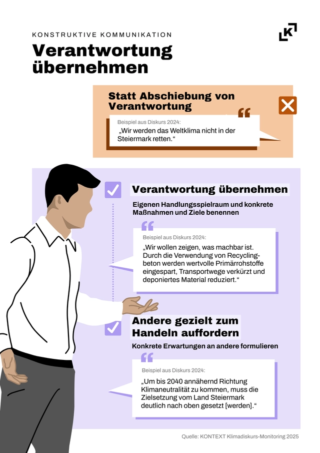 Demnach erweist sich die Kommunikation dann als konstruktiv, wenn sie legitime Bedenken aufnimmt, wirksame Lösungen anbietet und den wirtschaftlichen, sozialen und sicherheitspolitischen Mehrwert von klimapolitischen Maßnahmen hervorhebt. Ein weiterer Faktor für konstruktiven Diskurs ist die Übernahme von Verantwortung – gerade von jenen, die in dem Thema viel Handlungsmacht besitzen, wie Politik und Unternehmen.