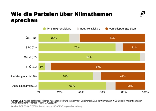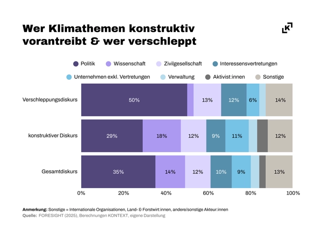 Bestimmt wurde der Diskurs im Jahr 2024, wie schon 2023, von Politiker:innen. Sie wandten häufiger Verschleppungstaktiken an als andere Akteursgruppen. Während SPÖ und Grüne vorwiegend konstruktiv über Klimapolitik sprachen, zeigte sich bei ÖVP und FPÖ ein anderes Bild: Sechs von zehn der klimapolitischen Aussagen der ÖVP und sogar neun von zehn der FPÖ tragen zum Verschleppungsdiskurs bei. Wissenschafter:innen hingegen argumentierten überwiegend konstruktiv. Aktivist:innen waren 2024 deutlich weniger präsent als im Jahr davor.