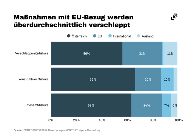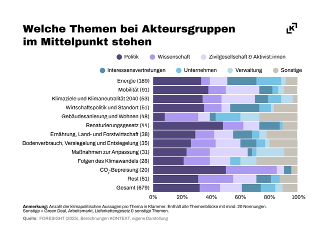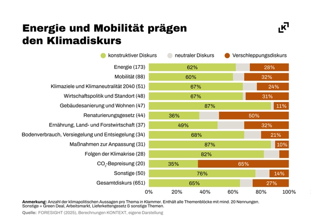 Inhaltlich dominierten die Themen Energie und Mobilität den klimapolitischen Diskurs. Je nach Thema zeigen sich erhebliche Unterschiede im Anteil verschleppender und konstruktiver Aussagen. So wurden Themen wie erneuerbare Energie und Elektrifizierung konstruktiver besprochen, während der Verkehrsbereich polarisierter diskutiert wurde. Beim EU-Renaturierungsgesetz und dem Ende der Neuzulassungen für Verbrenner-Autos wurde besonders häufig verschleppt. Die Themen Gebäude und Wohnen, die Folgen der Klimakrise und Anpassungsmaßnahmen wurden hingegen überwiegend konstruktiv besprochen.