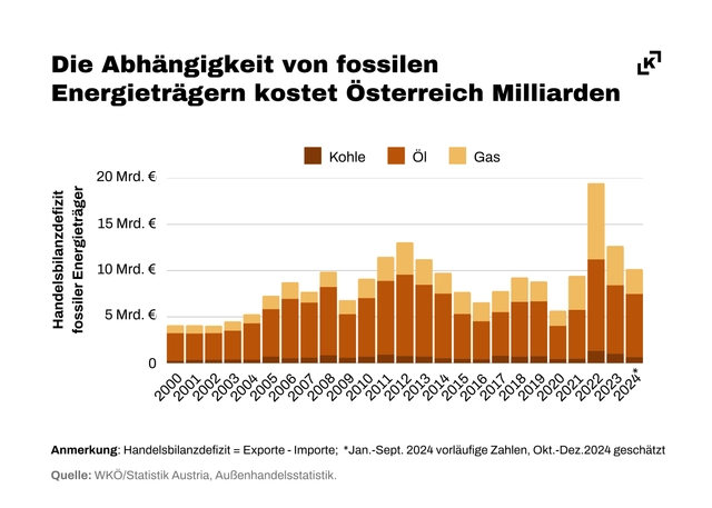 Nicht zuletzt gehen mit Importabhängigkeiten von fossilen Energien auch erhebliche Kosten und dadurch Wettbewerbsnachteile. Das verdeutlichen die milliardenschweren Ausgaben für fossile Energien Österreichs: Der Kriegsbeginn ließ das Handelsbilanzdefizit – also die Kosten von Importen im Vergleich zu Exporteinnahmen – im Jahr 2022 auf über 19 Milliarden Euro ansteigen. Aber auch im Schnitt 2015 bis 2019 belief es sich bereits auf acht Milliarden Euro pro Jahr.