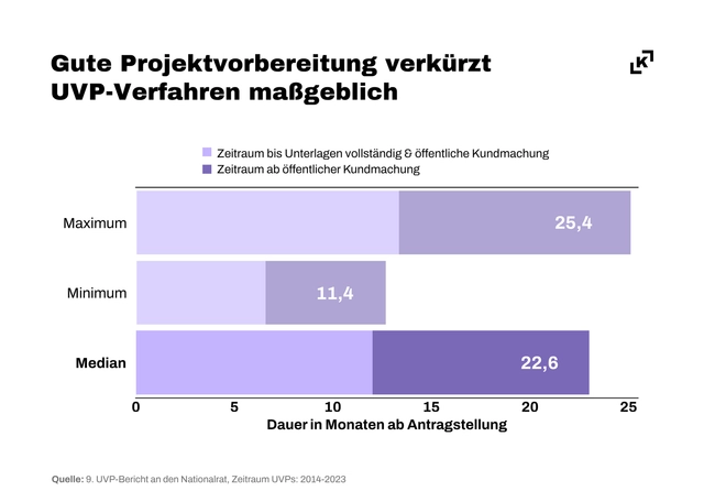 - Qualität der Projektunterlagen verbessern: Derzeit macht die Phase der Projekteinreichung durch die Projektwerbenden im Schnitt die Hälfte der Dauer von UVP-Verfahren aus. Frühzeitige, strukturierte Projektplanung, klare behördliche Anforderungen und stärkere Nutzung freiwilliger Vorverfahren können helfen, die Phase des Projektantrags zu verkürzen.