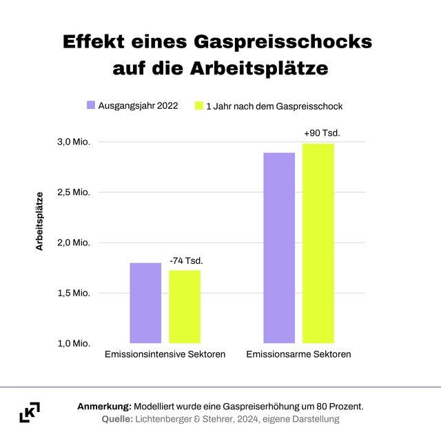 - Ein Gaspreisschock von +80 Prozent lässt die Wertschöpfung in emissionsintensiven Sektoren um 6,6 Prozent im Folgejahr und jeweils 5,8 Prozent in den darauffolgenden zwei Jahren einbrechen.