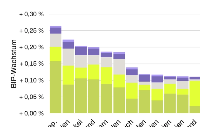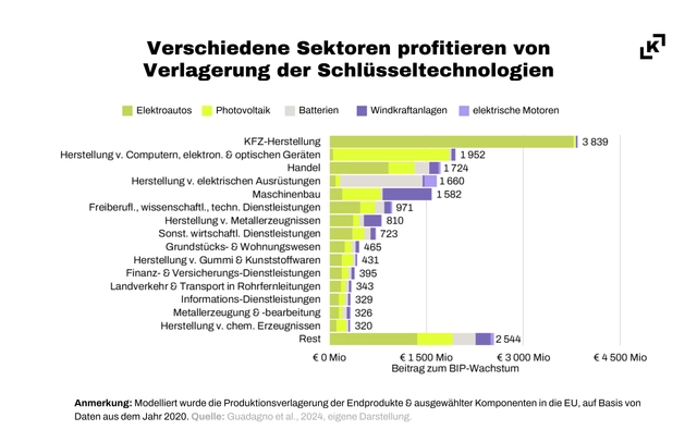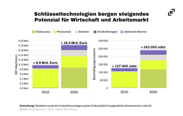 Derzeit ist die Europäische Union bei einigen grünen Technologien auf Importe angewiesen. Dieser Trend hat sich in den letzten Jahren verstärkt. Würde die EU die Fertigung fünf definierter Schlüsseltechnologien – Elektroautos, Photovoltaik, Windkraftanlagen, Batterien und elektrische Motoren – selbst übernehmen, hätte das einen stark positiven Gesamteffekt auf das Bruttoinlandsprodukt (BIP) der Europäischen Union: ein Plus von rund 18,4 Milliarden Euro. Die Produktion von Elektroautos (+ 8,8 Milliarden Euro) trägt dabei am stärksten zur Steigerung der Wirtschaftsleistung bei, gefolgt von Photovoltaik (+ 4,7 Milliarden Euro) und Batterien (+ 2,6 Milliarden Euro).