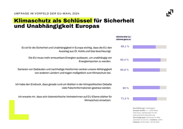 Wien, 10. Mai 2024: In knapp einem Monat wählen die Österreicher:innen ein neues EU-Parlament. Der Ausgang der Wahl wird entscheidend dafür, wie die heimische Energiezukunft gestaltet werden kann. Mehr als zwei Drittel der österreichischen Bevölkerung geht es in dieser Sache zu langsam: Sie halten es im Sinne der Sicherheit und Unabhängigkeit Europas für notwendig, dass die EU den Ausstieg aus Öl, Kohle und Gas beschleunigt. Das zeigt eine neue Umfrage im Auftrag des KONTEXT Instituts für Klimafragen. Befragt wurden dazu 1.000 Personen durch das Meinungsforschungsinstituts marketagent. Die Ergebnisse sind repräsentativ für die österreichische Bevölkerung.